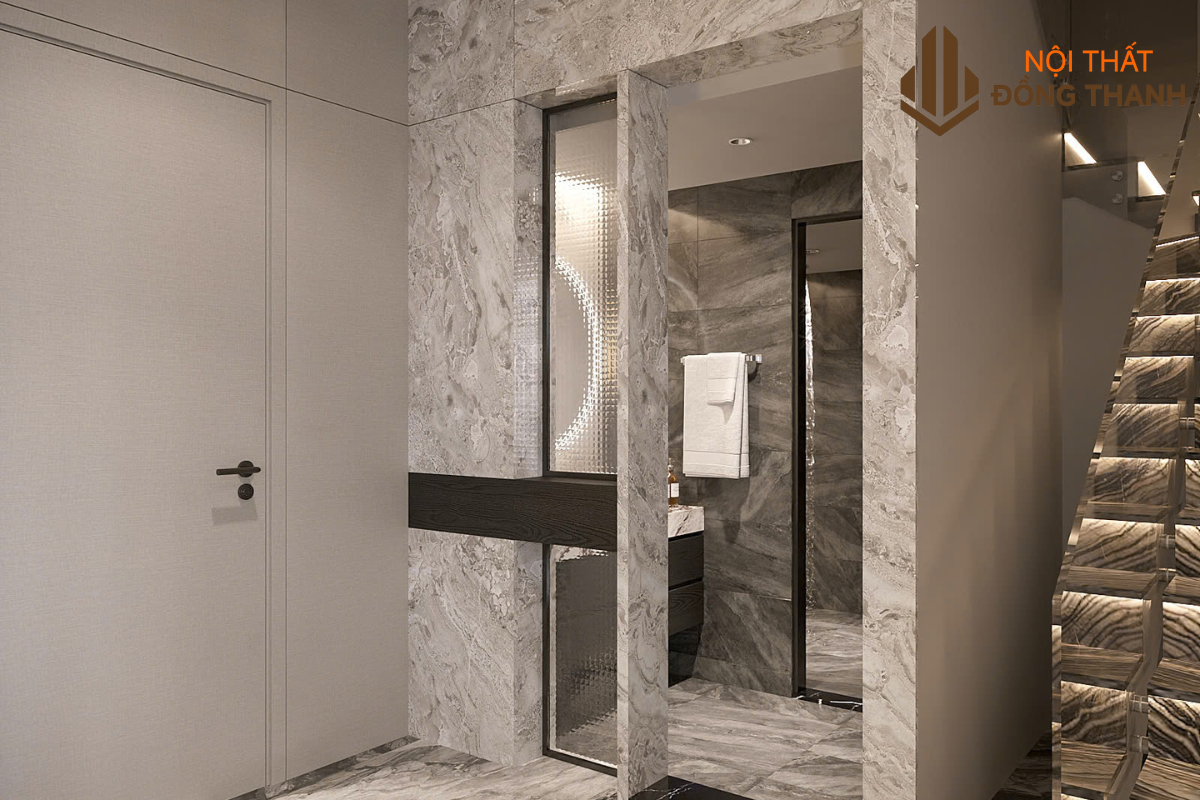 Phòng tắm được thiết kế với sàn và tường được ốp đá marble sáng, kết hợp với vách kính trong suốt và phụ kiện ánh titan. Bồn tắm độc lập đặt cạnh ô cửa lớn, nơi ánh sáng tự nhiên và những bóng cây ngoài sân vườn giao hòa với hơi nước ấm. Ánh đèn vàng dịu phản chiếu lên bề mặt nước tạo cảm giác an yên, thư thái – như một khoảng lặng sau mỗi ngày dài.