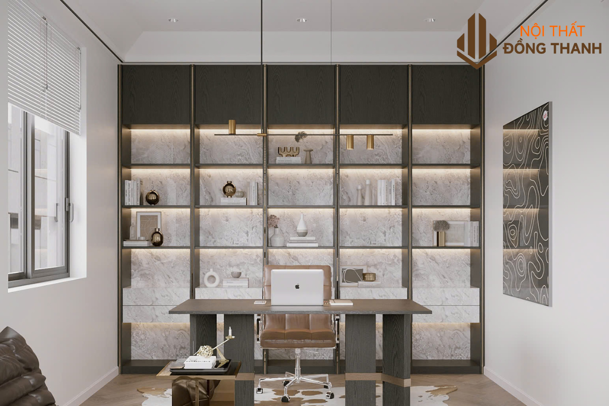 Không gian phòng làm việc được thiết kế riêng biệt, mang tính riêng tư và tập trung cao. Tông màu trung tính kết hợp cùng nội thất gỗ sậm và ánh sáng trắng lạnh giúp tăng cường khả năng tư duy.