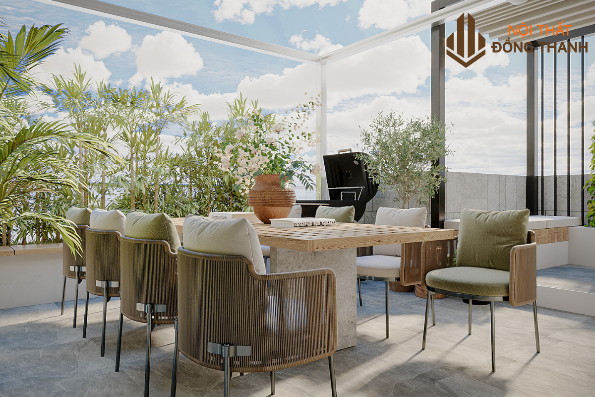 Không gian sân thượng  và ban công là điểm nhấn gửi gắm trọn vẹn tinh thần sống hiện đại của gia chủ. Bàn ghế ngoài trời làm từ gỗ chống ẩm kết hợp cùng đệm vải chống nắng, xung quanh được bao phủ bởi cây xanh và hệ đèn dây ấm áp.
