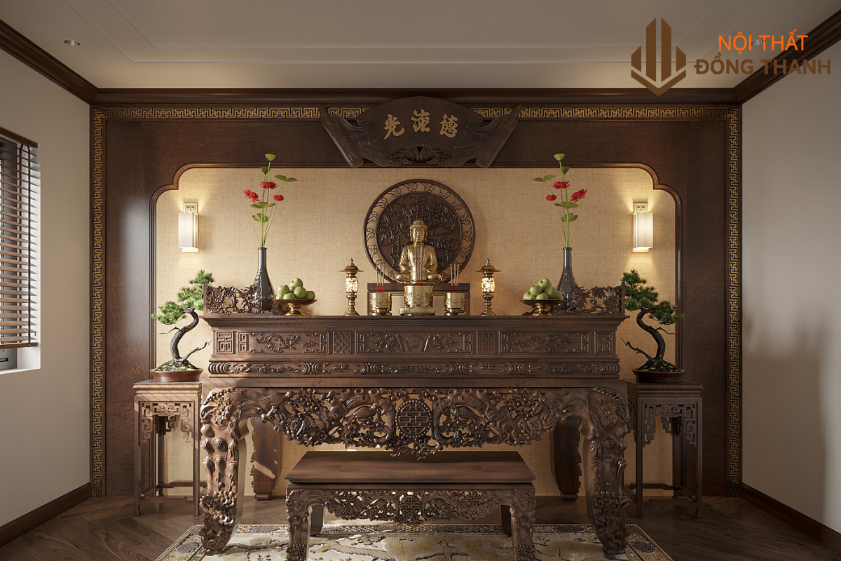 Phòng thờ được bố trí ở vị trí cao nhất của ngôi nhà để thu hút sinh khí, tài lộc. Tông gỗ trầm, ánh sáng vàng nhẹ và mùi hương trầm thoang thoảng tạo nên không gian linh thiêng và ấm cúng.