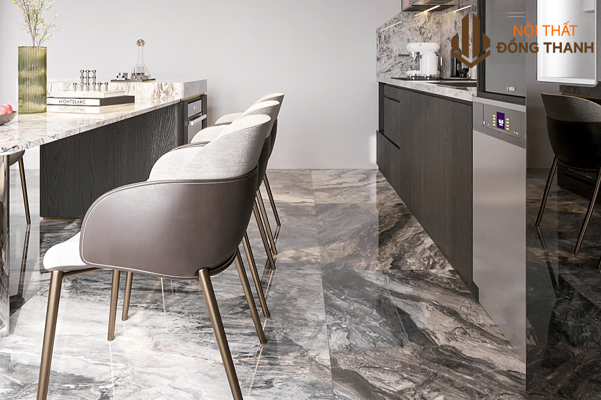 Phòng ăn nối liền bếp với bàn mặt đá và ghế bọc vải linen be sáng. Ánh sáng từ cửa sổ lớn mang đến cảm giác rộng thoáng, ấm cúng.