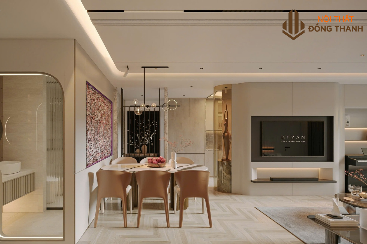 Khu vực bàn ăn thông liền với phòng khách, phù hợp với thiết kế của các khu chung cư