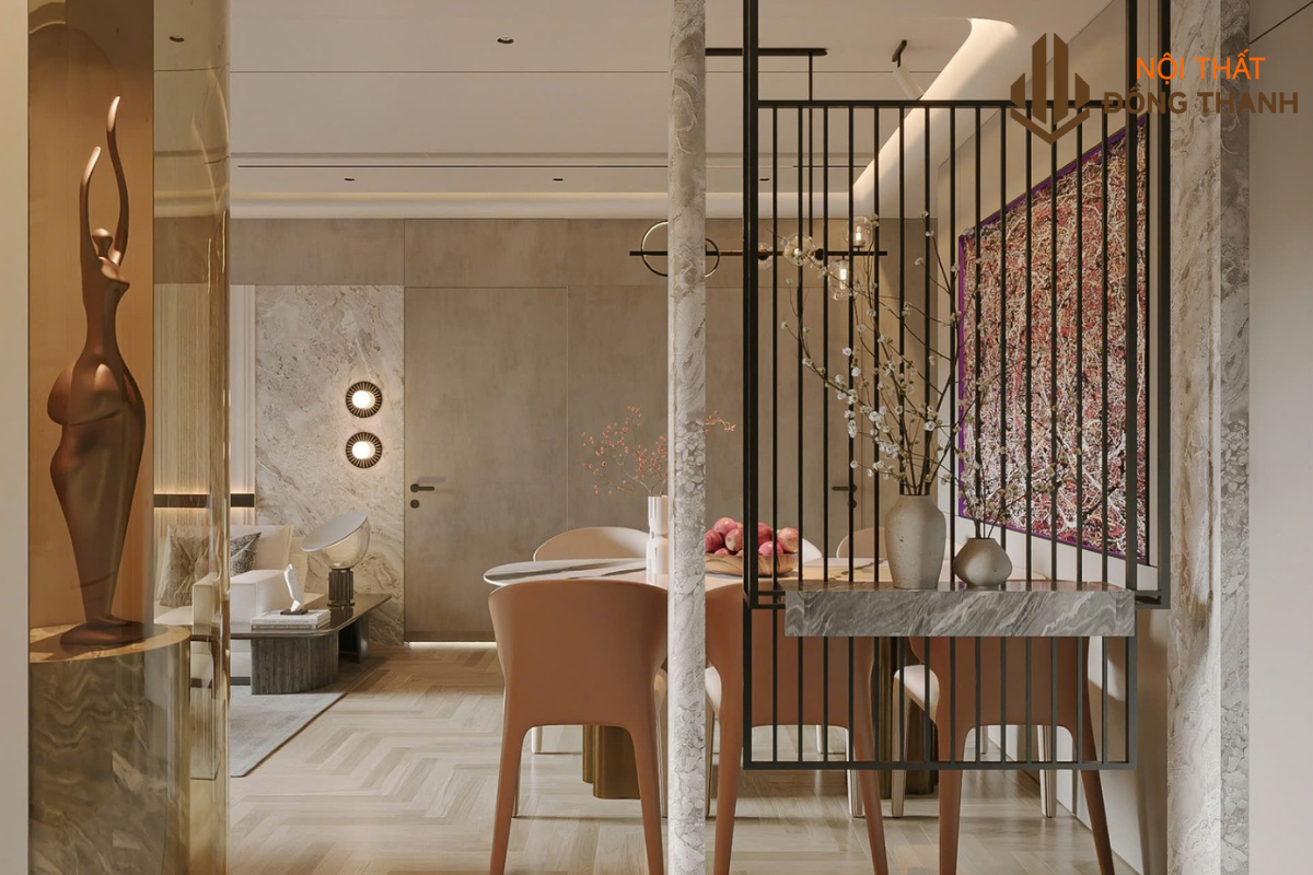 Khu vực bàn ăn thông liền với phòng khách, phù hợp với thiết kế của các khu chung cư