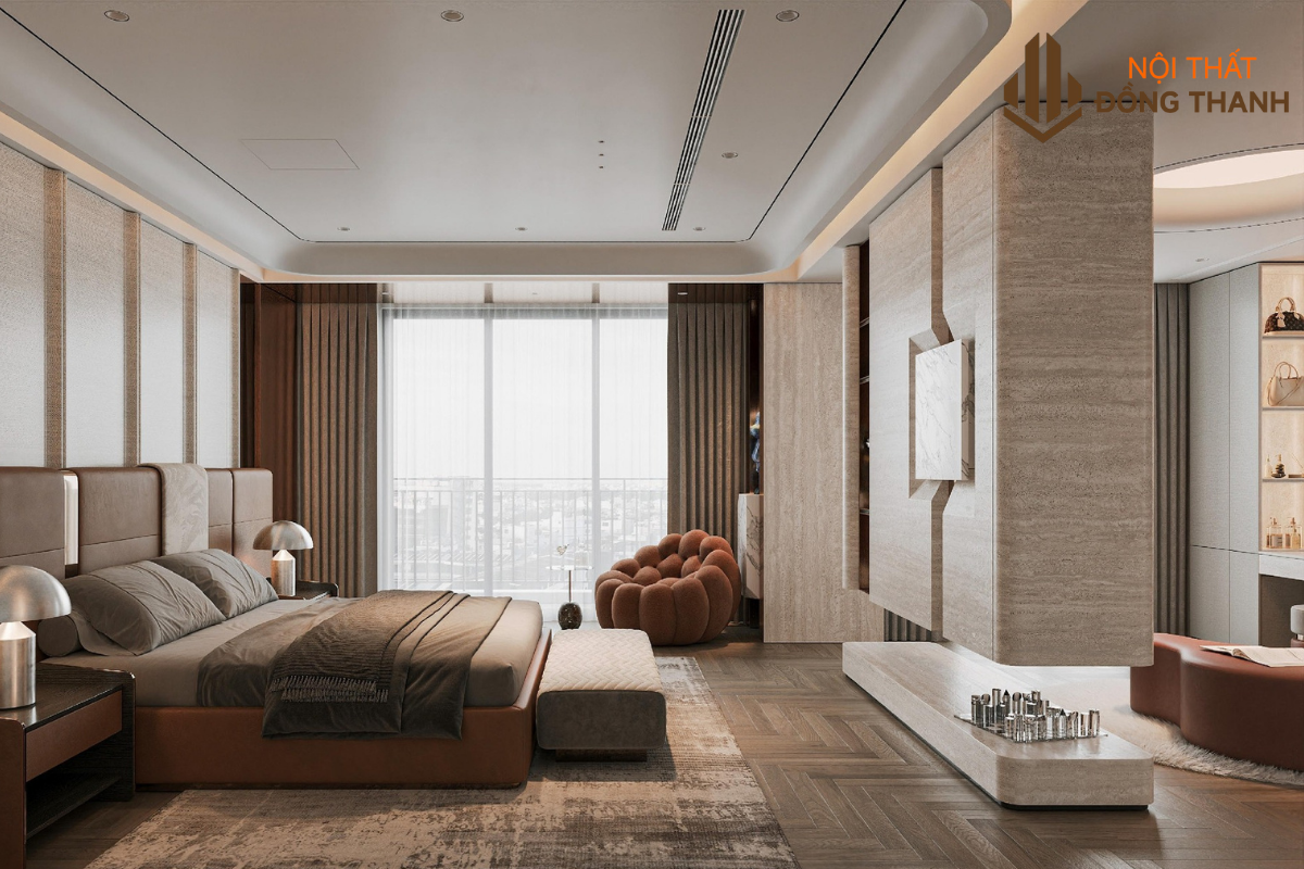 Phòng ngủ chính mang tông màu nhẹ nhàng với điểm nhấn là cửa ban công lớn, giúp không khí luôn lưu thông và tràn ngập ánh sáng tự nhiên.