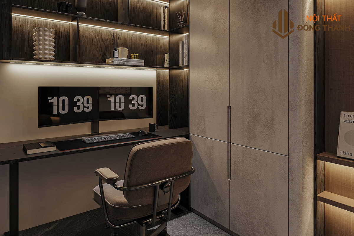 Trong phòng master còn sở hữu bộ bàn làm việc cho gia chủ. Kết hợp với kệ tủ sách âm tường có đèn led cao cấp. Sử dụng rèm che hiện đại tông màu nâu xám đồng bộ với phong cách của cả căn phòng.