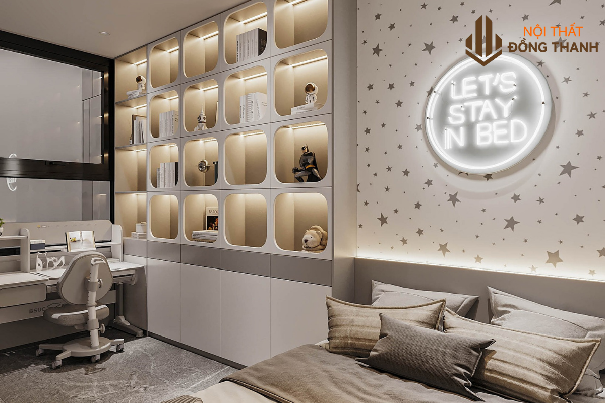 Dự án nhà phố Hoàng Mai được thiết kế với hệ thống phòng ngủ phụ tối ưu không gian. Giường nhỏ kết hợp với hệ tủ có đèn led độc đáo. Bàn học được thiết kế đối diện phòng tạo không gian học tập cho con.