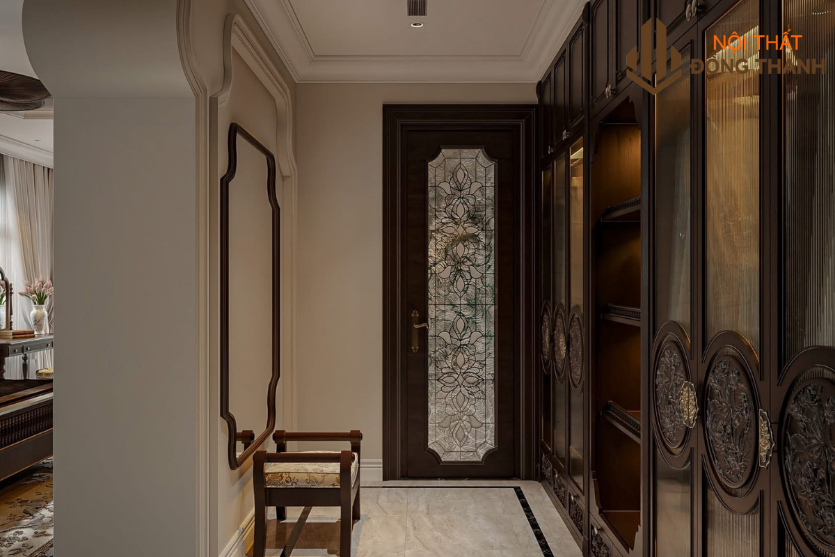 Khu vực phòng thay đồ với không gian vừa phải, không quá lớn, tích hợp hệ tủ mở đơn giản. Có sẵn gương kích thước lớn để gia chủ thuận tiện khi soi và thay đồ. Tủ đồ có thiết kế chạm khắc riêng, nổi bật, dùng chất liệu gỗ cao cấp, chống mối mọt, chống ẩm.