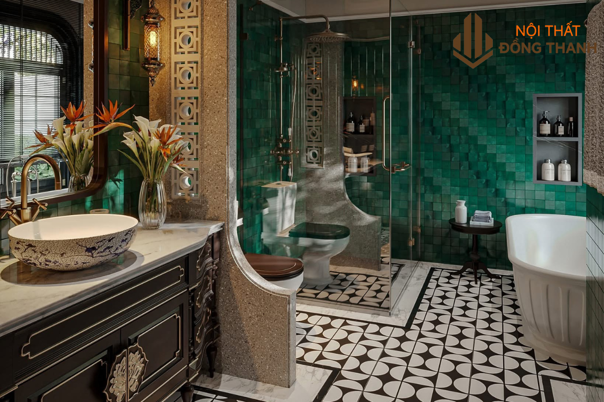 Phòng tắm là sự giao thoa hoàn hảo giữa xưa và nay. Ốp tường bằng đá granite màu khói, sàn lát gạch gốm thủ công, xen kẽ những viên gạch nhỏ hình ngói âm dương.