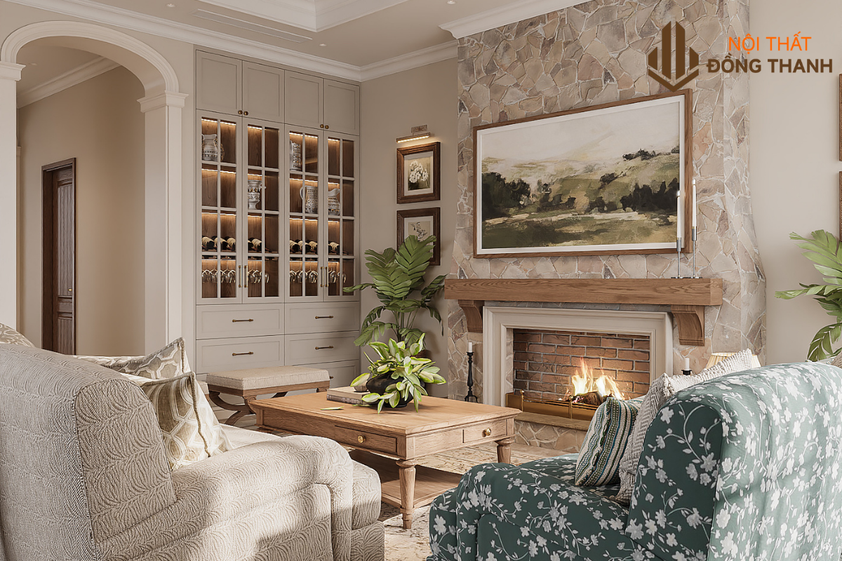 Phòng khách là trái tim của ngôi nhà – nơi thể hiện rõ nhất tinh thần Bắc Âu của biệt thự. Đồng Thanh lựa chọn bảng màu sáng nhẹ làm chủ đạo, kết hợp chất liệu tự nhiên như gỗ sồi, vải lanh, đá mộc để mang lại cảm giác gần gũi, thư thái.