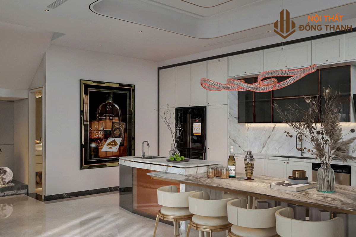 Phía trên là đèn thả hiện đại ánh vàng dịu nhẹ, cùng hệ thống tủ bếp âm tường tích hợp đèn led tạo nên khung cảnh ấm cúng, lý tưởng cho những bữa ăn sum họp.