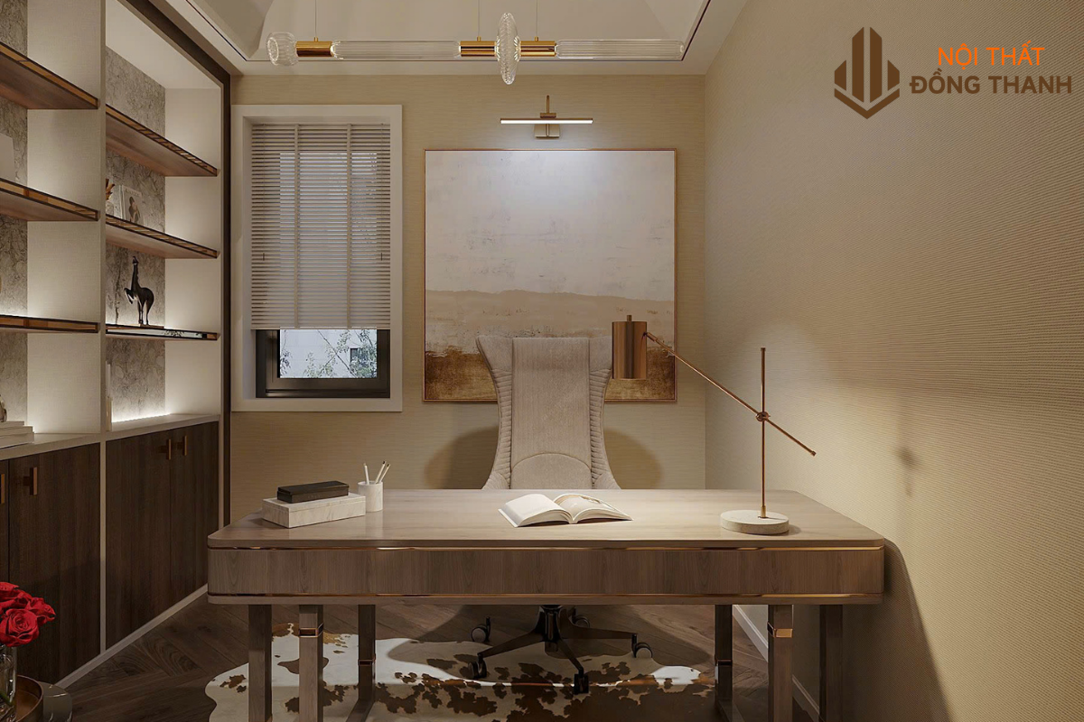 Không gian làm việc tại biệt thự An Lạc Green Symphony được thiết kế theo phong cách hiện đại với bàn gỗ tích hợp sạc không dây, đèn tự điều chỉnh ánh sáng, ghế công thái học và cây xanh thanh lọc không khí. Không gian đủ yên tĩnh để tập trung, đủ đẹp để sáng tạo, và đủ hiện đại để hòa mình vào nhịp sống số. Gia chủ làm việc trong thời gian dài vẫn tràn đầy năng lượng, cảm hứng sáng