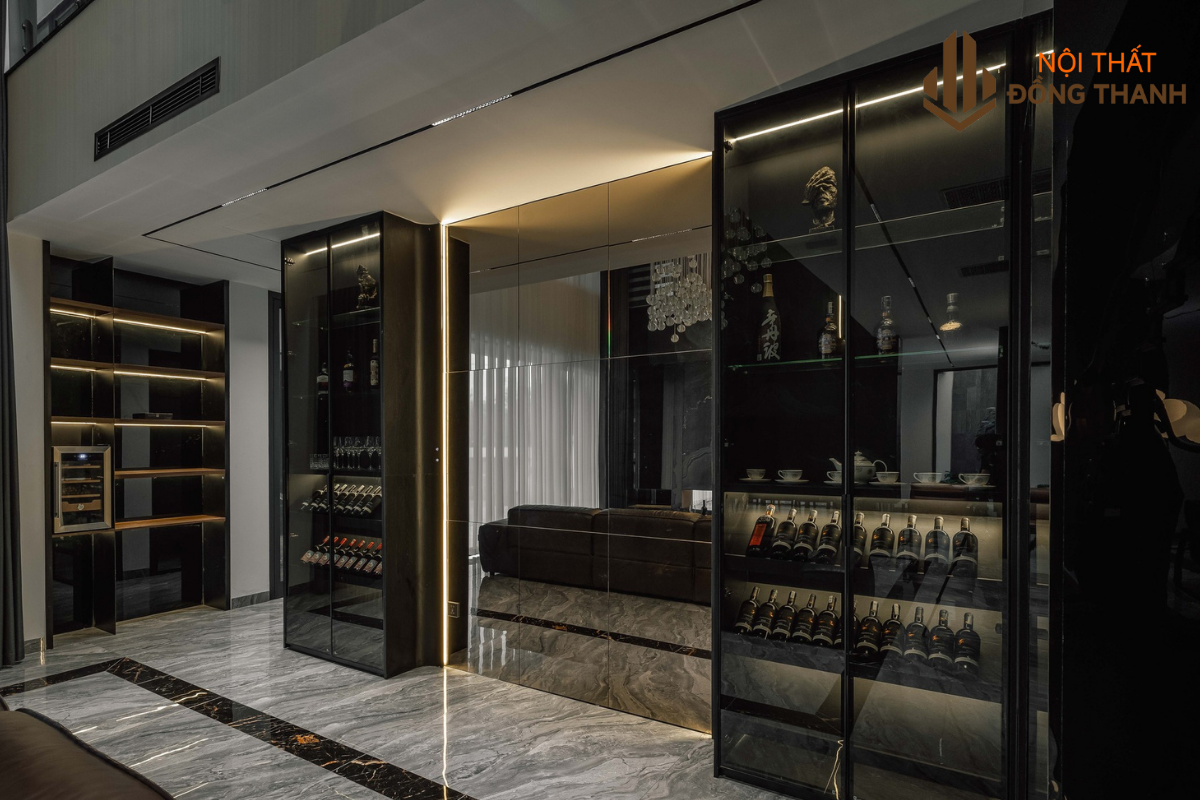 Không gian phòng khách được định hình theo gam màu ghi xám – đen chủ đạo, xen lẫn những điểm nhấn tinh khiết từ màu trắng – tạo nên vẻ đẹp thanh lịch và hiện đại. Ngay từ khu vực sảnh vào, tủ rượu âm tường được bố trí khoa học, tay nắm cửa thiết kế tối giản nhưng độc đáo, thể hiện gu thẩm mỹ tinh tế của gia chủ.