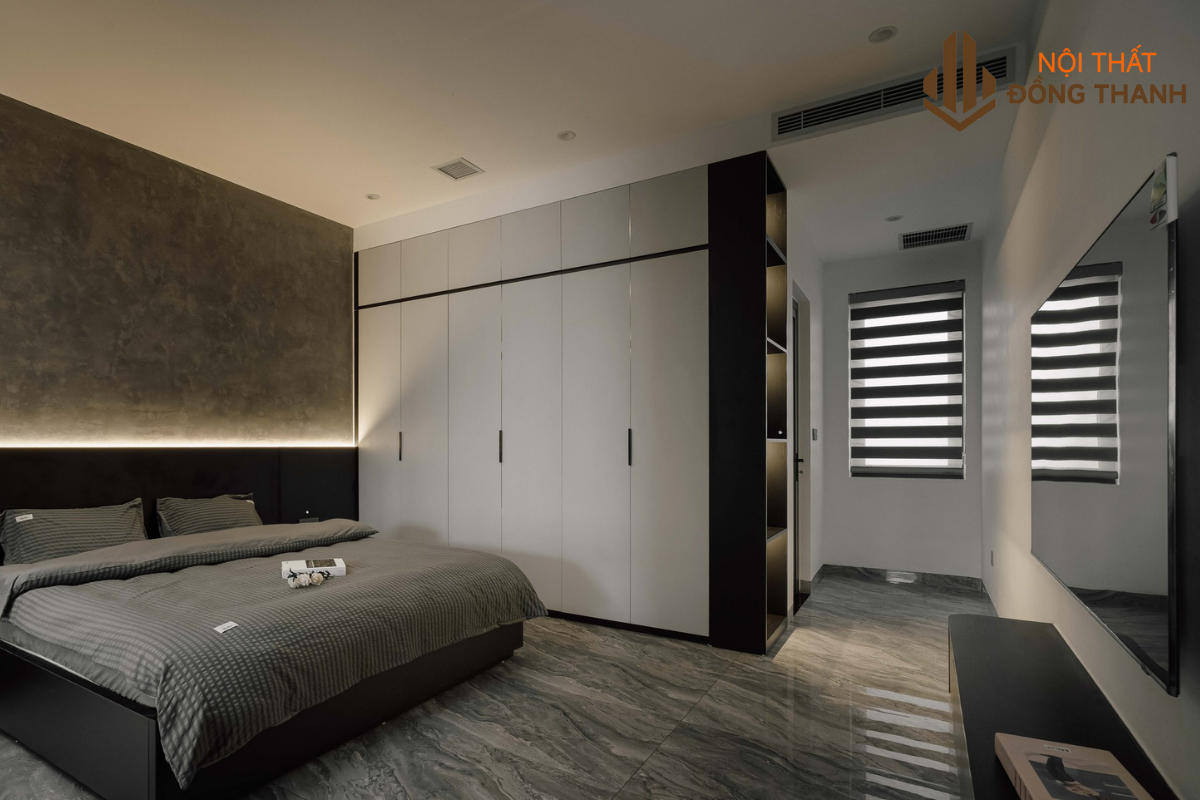 Giường ngủ sử dụng nỉ cao cấp cùng đệm êm ái, mang đến giấc ngủ sâu và chất lượng. Không gian được chia tách hợp lý giữa khu nghỉ ngơi và khu thay đồ, giúp căn phòng trở nên gọn gàng và tiện nghi hơn.