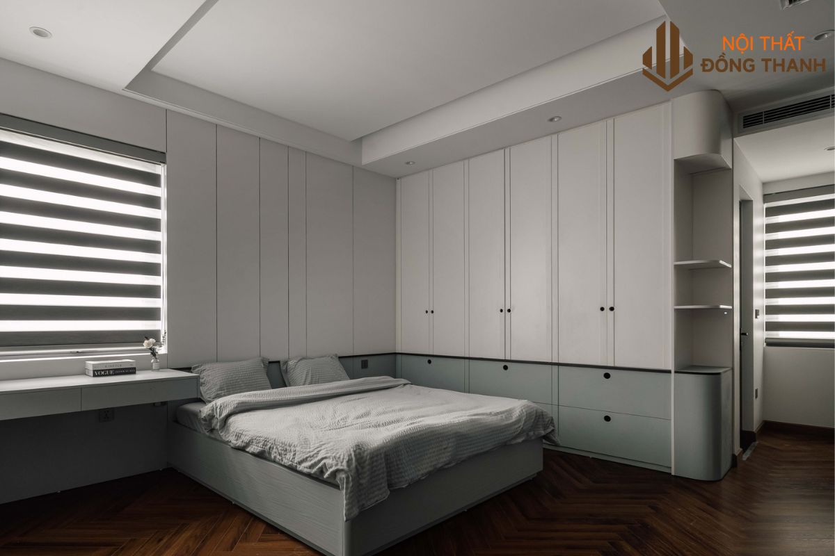 Giường ngủ sử dụng nỉ cao cấp cùng đệm êm ái, mang đến giấc ngủ sâu và chất lượng. Không gian được chia tách hợp lý giữa khu nghỉ ngơi và khu thay đồ, giúp căn phòng trở nên gọn gàng và tiện nghi hơn.