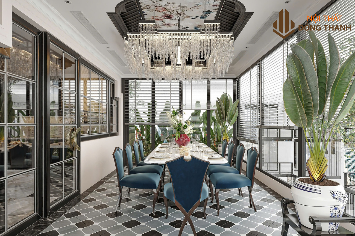 Khu vực phòng ăn với nhiều cửa sổ, có thể ngắm nhìn khung cảnh bên ngoài đồng thời giúp không gian mở rộng hơn.
