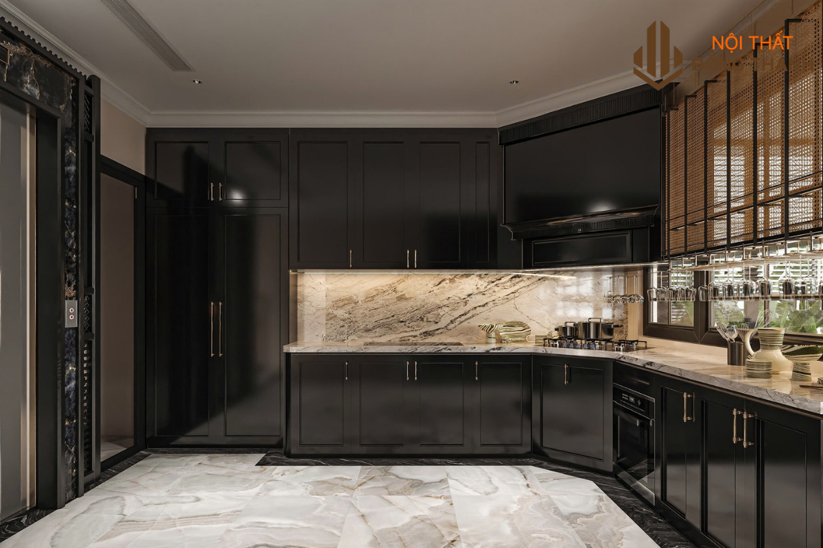 Khu vực bếp và phòng ăn được thiết kế nối liền nhau, hướng đến sự tiện nghi nhưng vẫn giữ nét duyên dáng truyền thống. Không gian bếp mang đậm hơi thở Đông Dương, với tủ bếp đen, mặt đá tự nhiên vân nhẹ, và hệ thống đèn treo bằng mây đan tỏa ánh sáng vàng ấm áp.