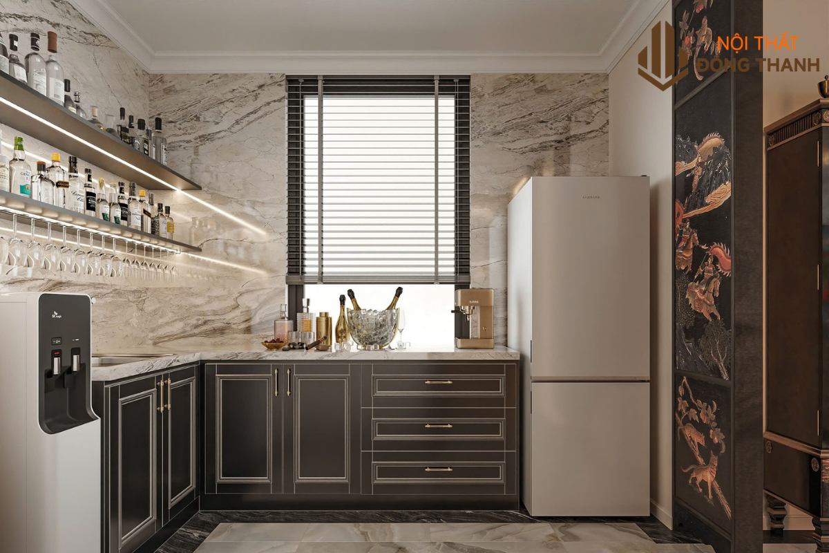 Không gian phòng bếp cổ điển với tone màu đen chủ đạo