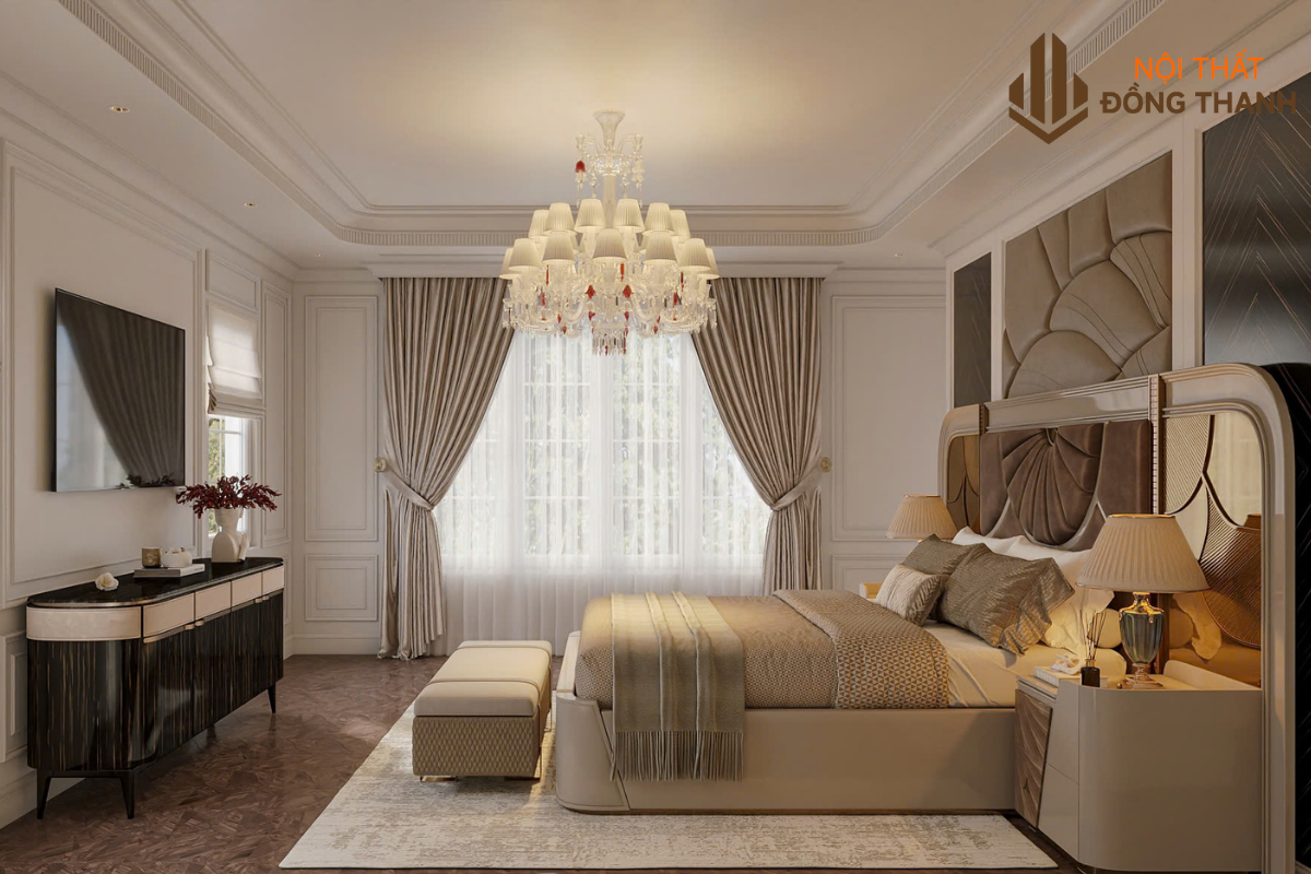 Phòng ngủ trong biệt thự Vĩnh Yên mang đậm phong vị Tân cổ điển Pháp với sự hòa quyện của đường cong mềm mại, gam màu dịu nhẹ và ánh sáng tinh tế.