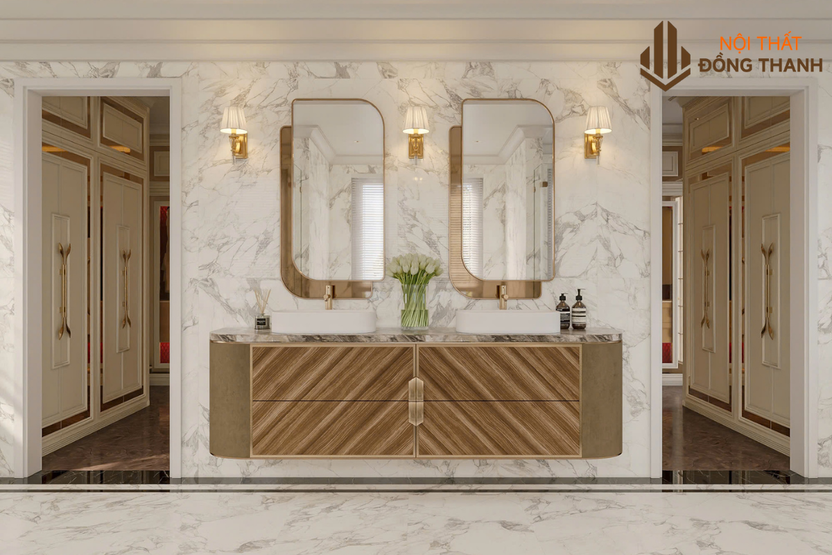 Vòi sen mạ vàng, lavabo đôi, tủ chứa đồ âm tường – tất cả được bố trí khoa học, gọn gàng và đầy tính thẩm mỹ.