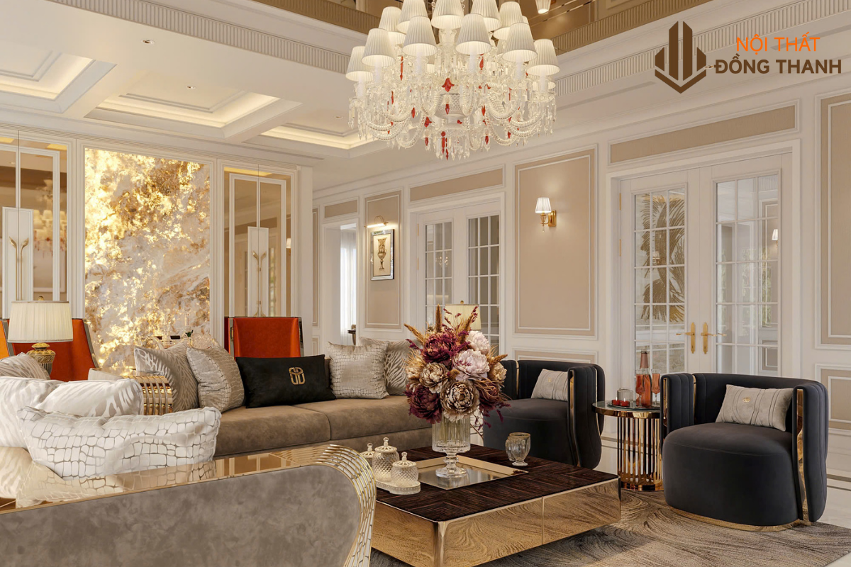 Bước vào biệt thự, phòng khách hiện ra như một bức tranh sống động của nghệ thuật kiến trúc Tân cổ điển.