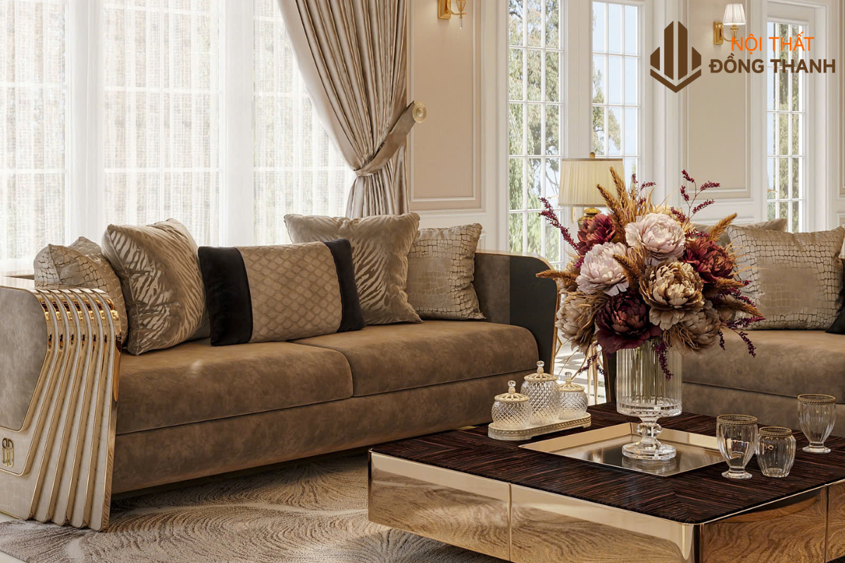 Bộ sofa bọc nỉ nhung màu kem nhạt, phối cùng bàn trà chân inox mạ vàng, mang đến vẻ đẹp thanh lịch nhưng không kém phần hiện đại.