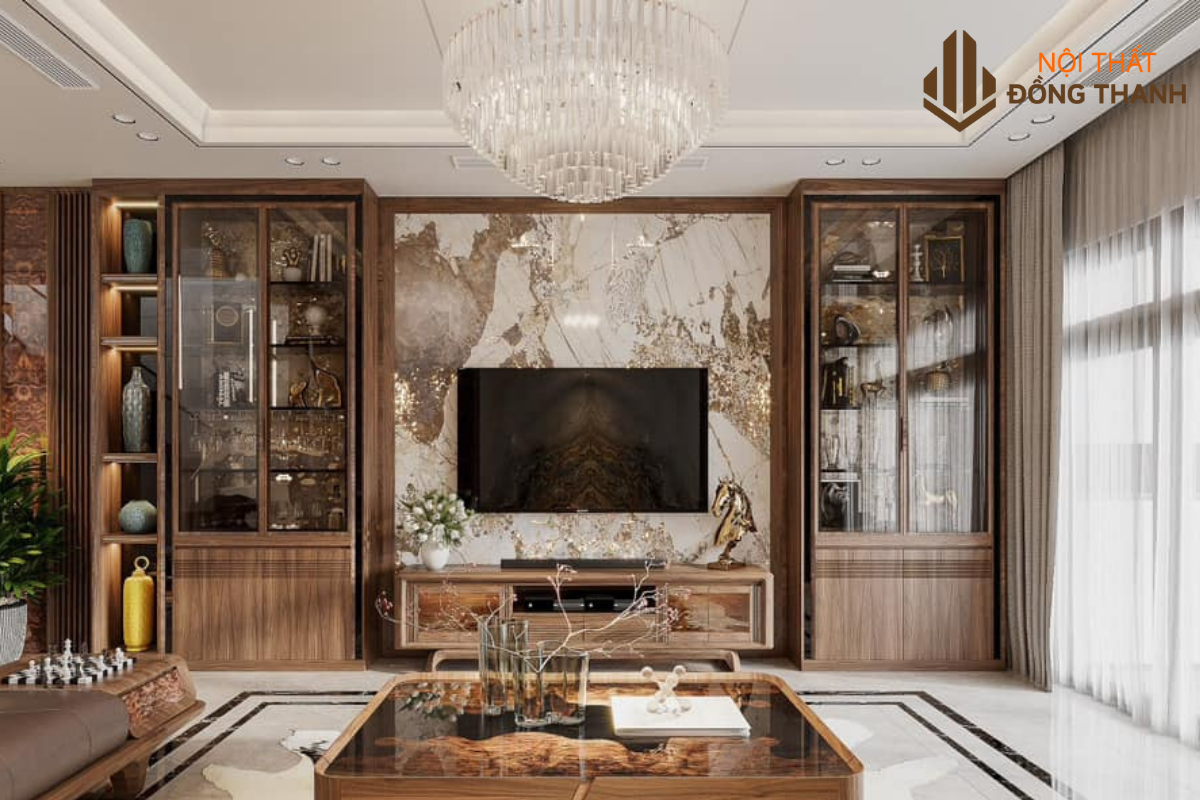 Hệ vách ốp gỗ phía sau kệ tivi được chạm khắc tinh tế, điểm xuyết bằng những đường chỉ đồng ánh nhẹ, khiến không gian thêm phần sang trọng.