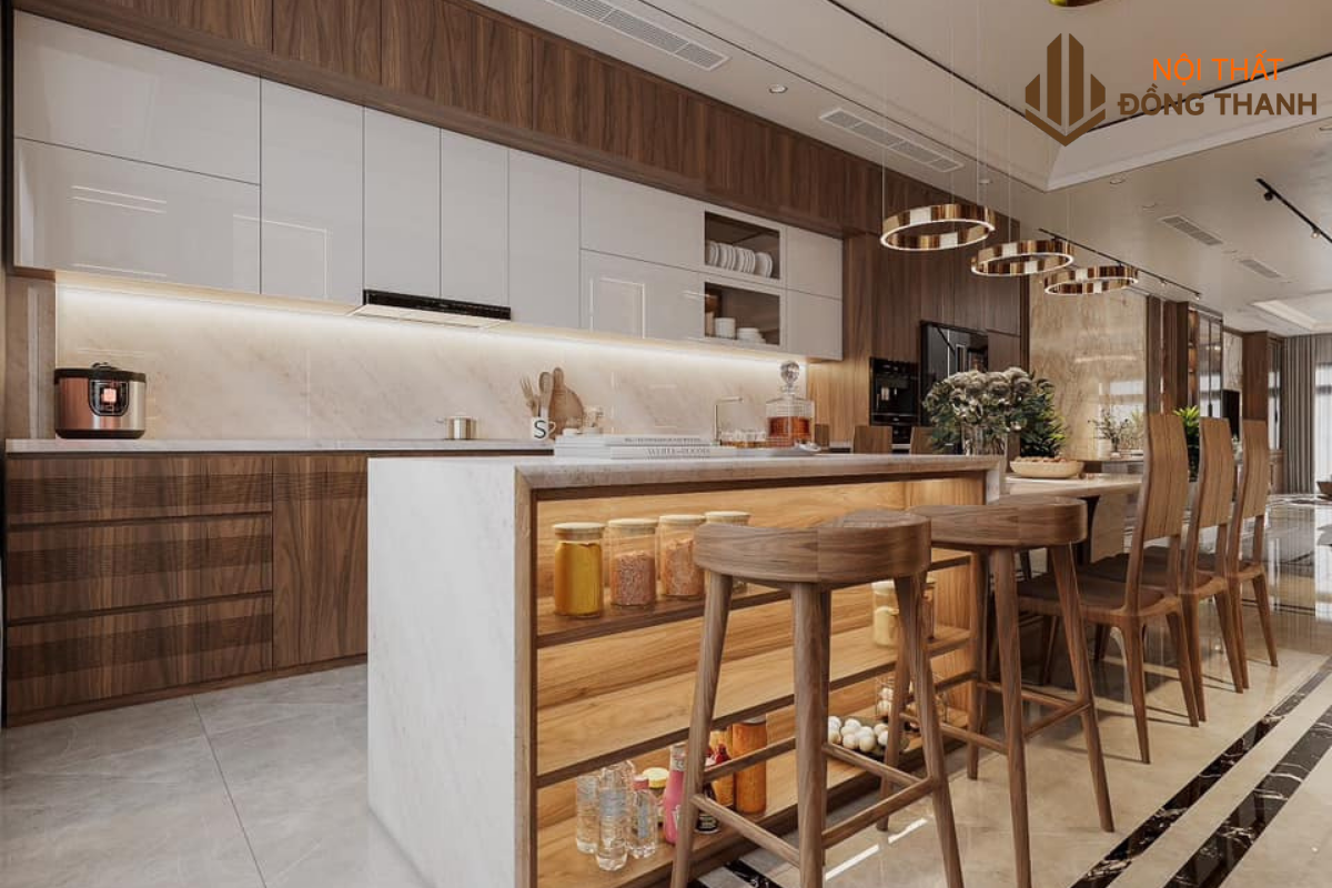 Không gian bếp mở hiện đại với tone màu nâu gỗ
