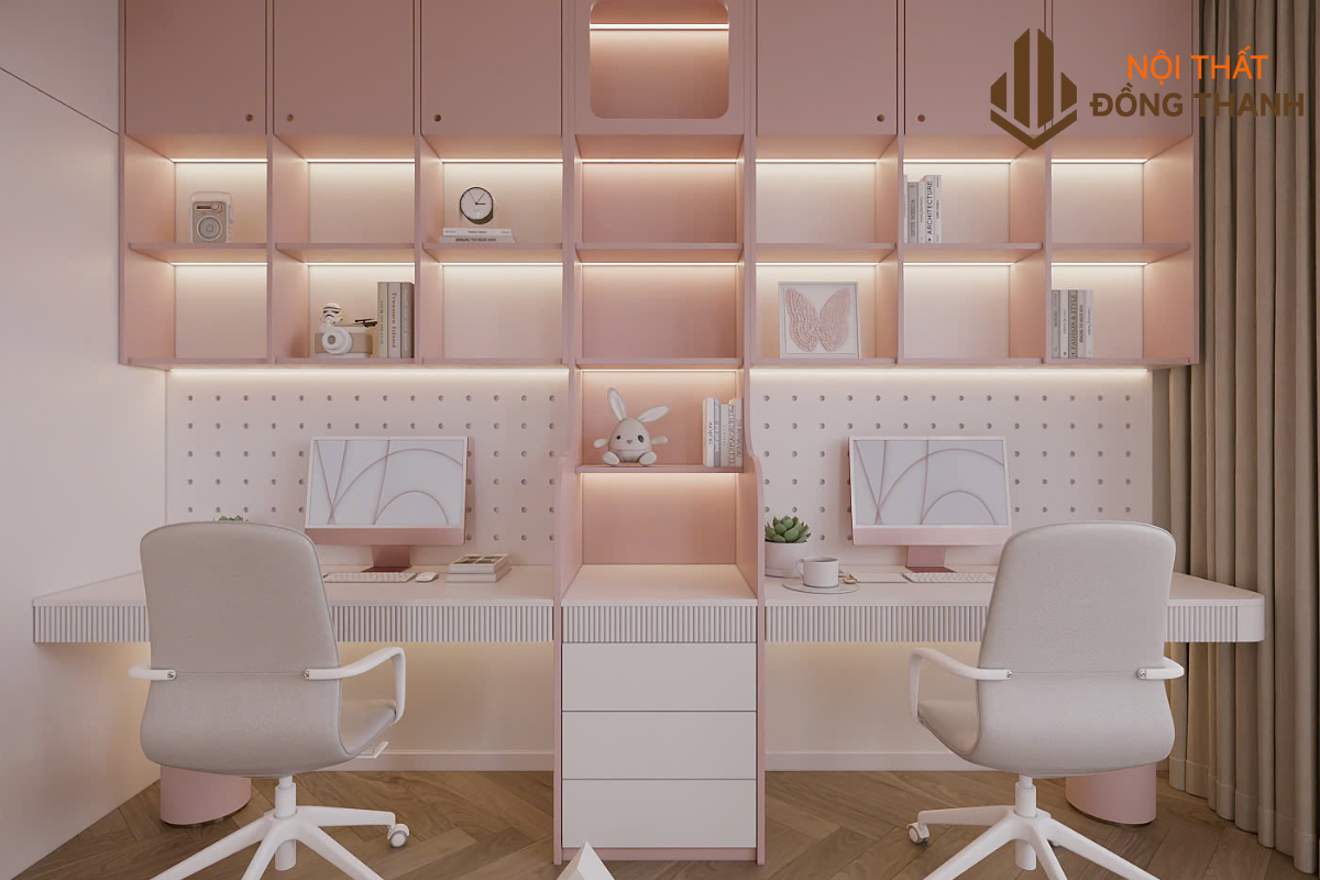 Kết hợp hệ tủ âm tường và bàn học giúp tối ưu hóa diện tích