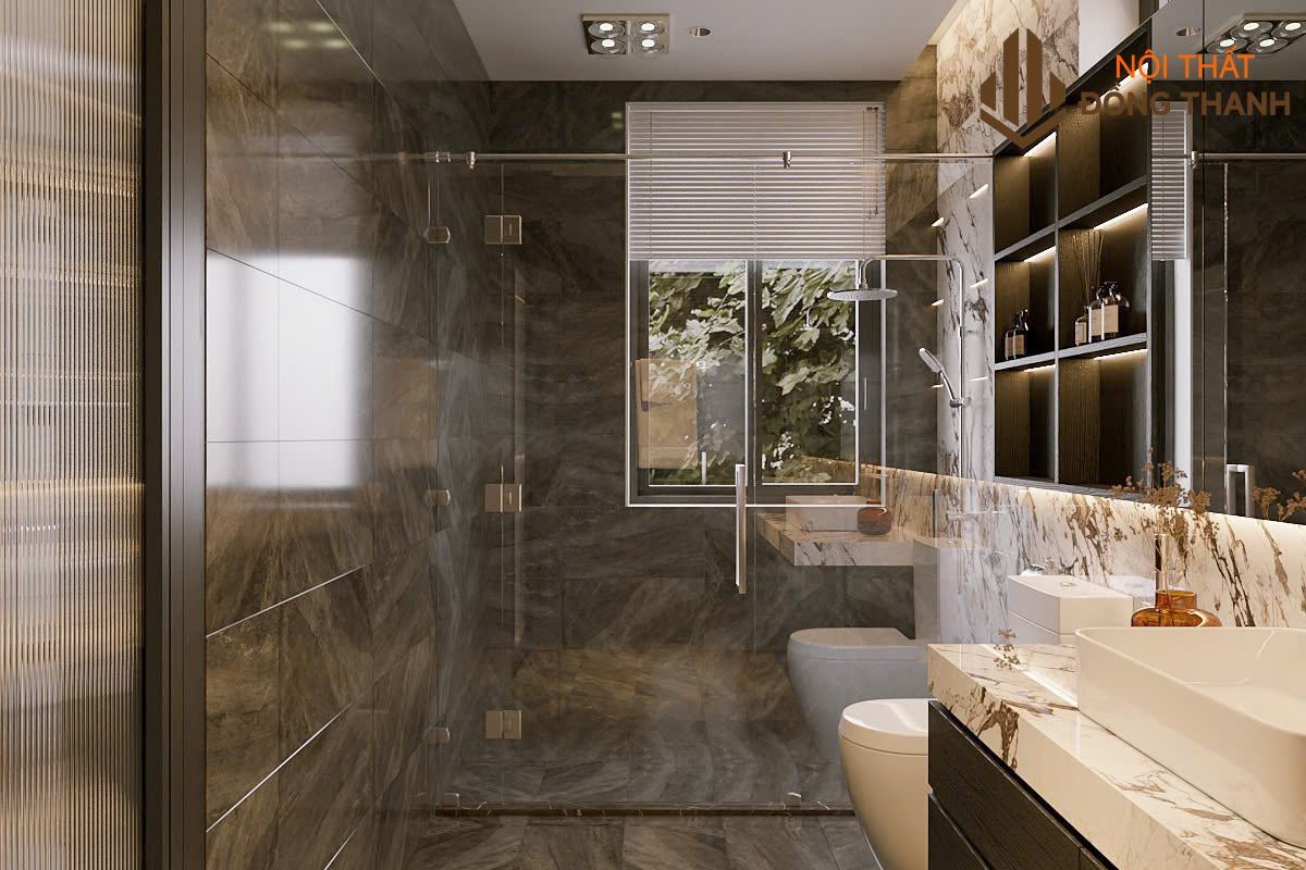 Phòng tắm sử dụng màu đá marble trắng xám chủ đạo kết hợp với thiết bị vệ sinh mạ titan ánh vàng, tạo nên cảm giác sang trọng tinh tế.