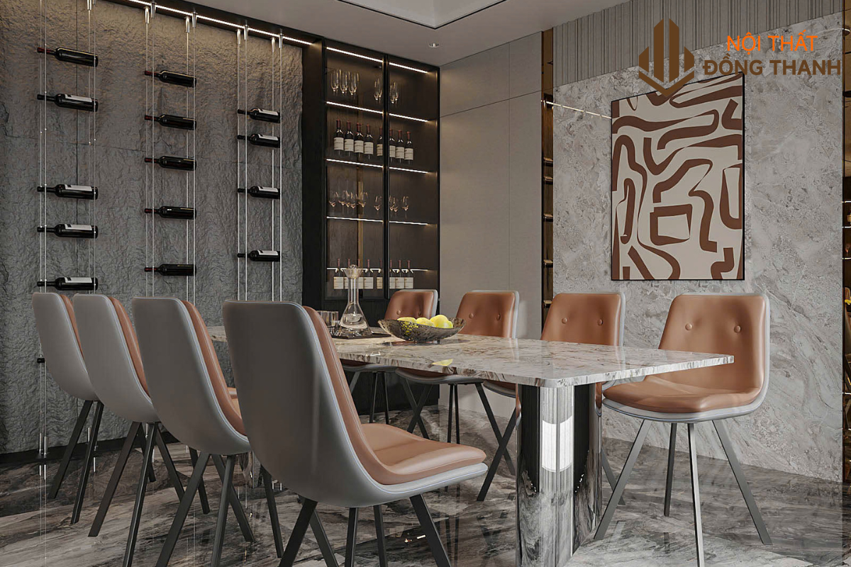 Bàn ăn lớn với mặt đá vân, kim loại được đặt liền kề với khu vực tủ rượu và phòng khách, ánh sáng xuyên qua lớp rèm mỏng, tạo nên không khí ấm áp và thi vị trong từng bữa cơm gia đình.