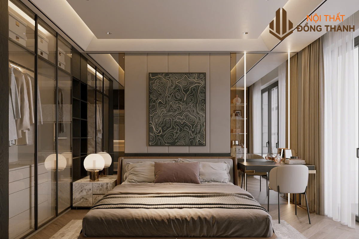 Phòng ngủ master là không gian của sự thư giãn tuyệt đối, nơi mọi chi tiết đều hướng đến sự riêng tư. Tường đầu giường được xử lý bằng phào chỉ âm và ánh sáng đèn led tạo nên hiệu ứng thị giác tinh tế.