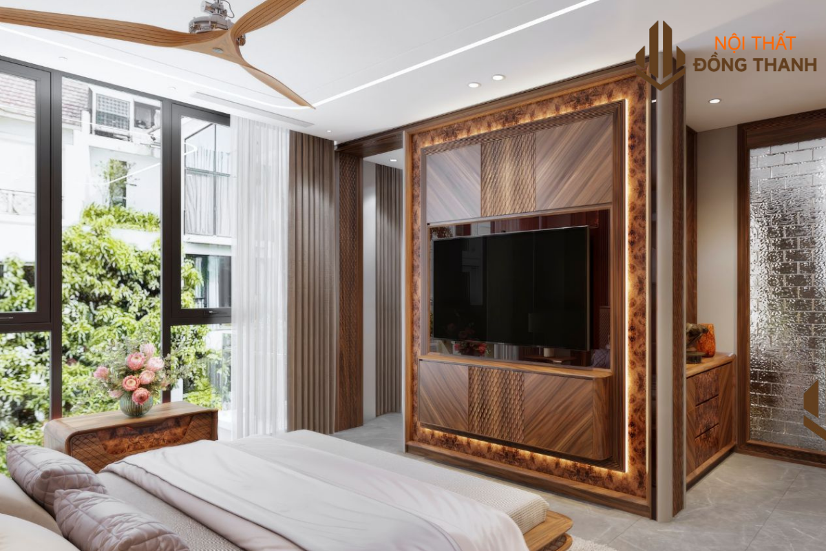 Các mảng tường và trần đều được xử lý bằng vật liệu tự nhiên, giữ cho căn phòng luôn ấm áp và có chiều sâu. Thiết kế vách tivi gỗ óc chó hiện đại, tone màu nâu vàng nhẹ nhàng kết hợp cùng quạt trần cao cấp.