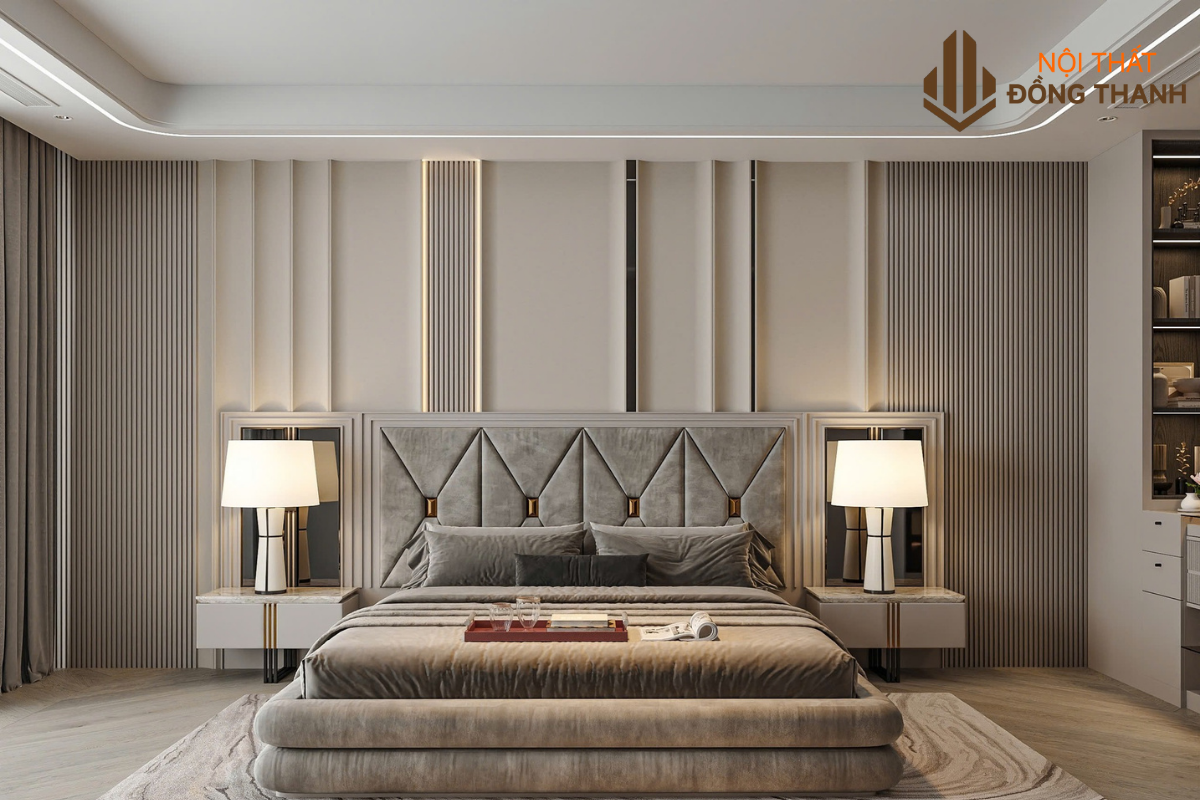Giường ngủ bọc nỉ cao cấp với đầu giường bọc da chần múi, hai bên là tab gỗ nhỏ đặt đèn ngủ ánh vàng nhẹ, mang lại cảm giác thư thái sau ngày dài bận rộn.