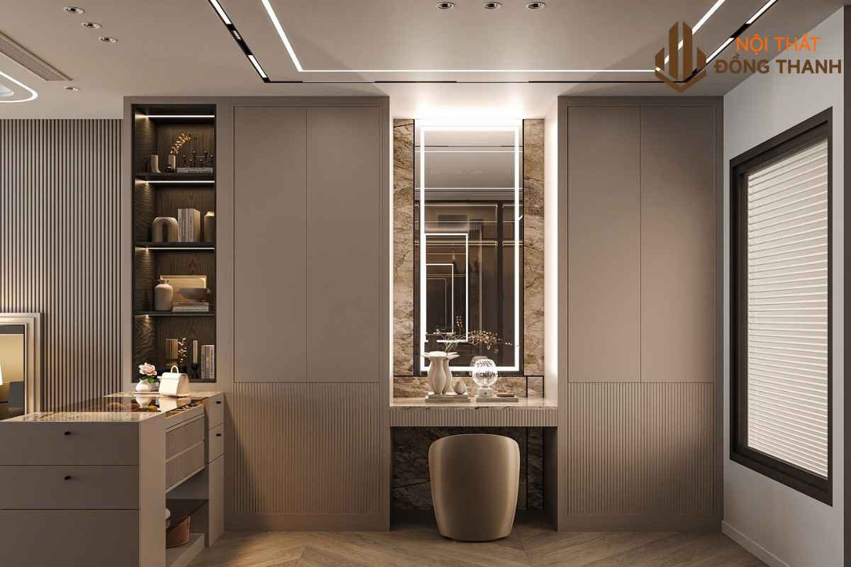 Phía đối diện là tủ quần áo âm tường cánh kính kết hợp đèn led hắt trong, vừa tiết kiệm diện tích vừa tăng hiệu ứng sang trọng. Góc làm việc nhỏ và bàn trang điểm được bố trí gần cửa sổ, đón ánh sáng tự nhiên, tạo sự thuận tiện cho sinh hoạt hằng ngày.