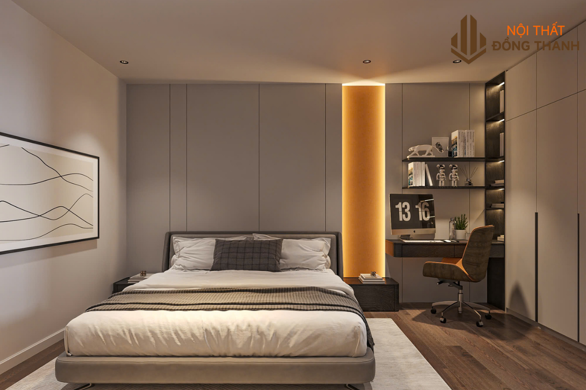 Phía đối diện là tủ quần áo âm tường cánh kính kết hợp đèn led hắt trong, vừa tiết kiệm diện tích vừa tăng hiệu ứng sang trọng. Góc làm việc nhỏ và bàn trang điểm được bố trí gần cửa sổ, đón ánh sáng tự nhiên, tạo sự thuận tiện cho sinh hoạt hằng ngày.