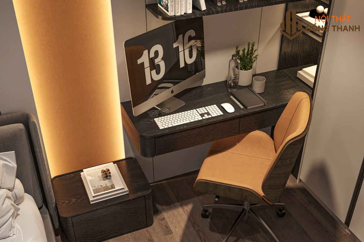 Phía đối diện là tủ quần áo âm tường cánh kính kết hợp đèn led hắt trong, vừa tiết kiệm diện tích vừa tăng hiệu ứng sang trọng. Góc làm việc nhỏ và bàn trang điểm được bố trí gần cửa sổ, đón ánh sáng tự nhiên, tạo sự thuận tiện cho sinh hoạt hằng ngày.