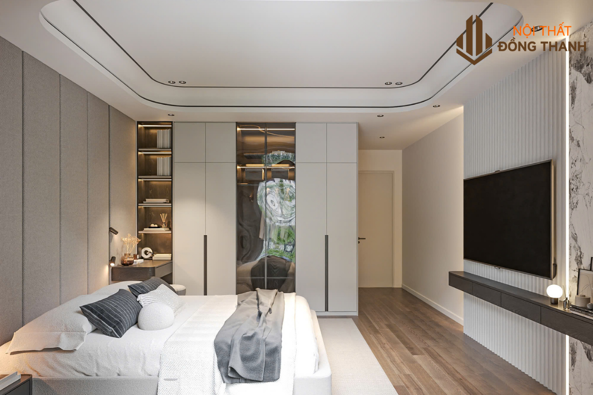 Phía đối diện là tủ quần áo âm tường cánh kính kết hợp đèn led hắt trong, vừa tiết kiệm diện tích vừa tăng hiệu ứng sang trọng. Góc làm việc nhỏ và bàn trang điểm được bố trí gần cửa sổ, đón ánh sáng tự nhiên, tạo sự thuận tiện cho sinh hoạt hằng ngày.