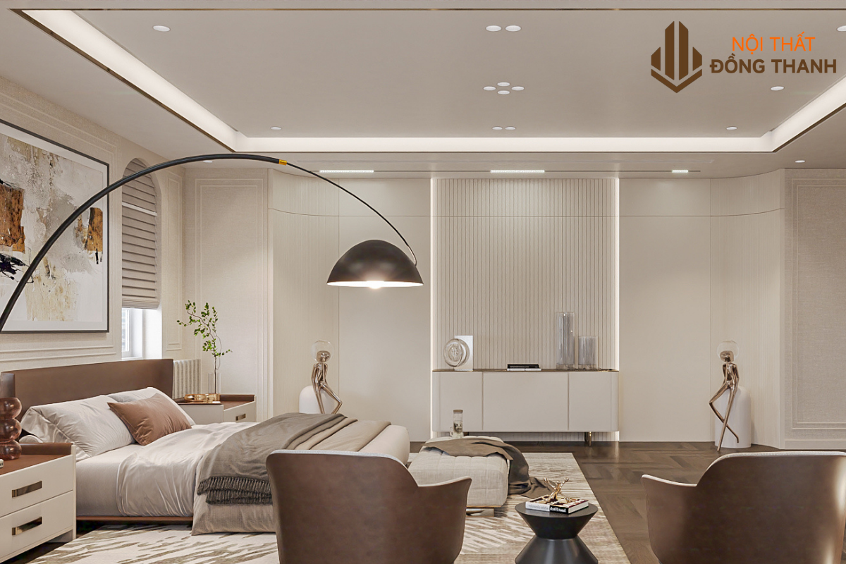 Phòng ngủ master rộng rãi với tone màu trầm ấm: nâu chocolate – ghi xám – be sáng. Giường trung tâm bọc nỉ nhung nhập khẩu, đầu giường được thiết kế liền hệ vách trang trí vân gỗ – tạo cảm giác êm ái và sang trọng.