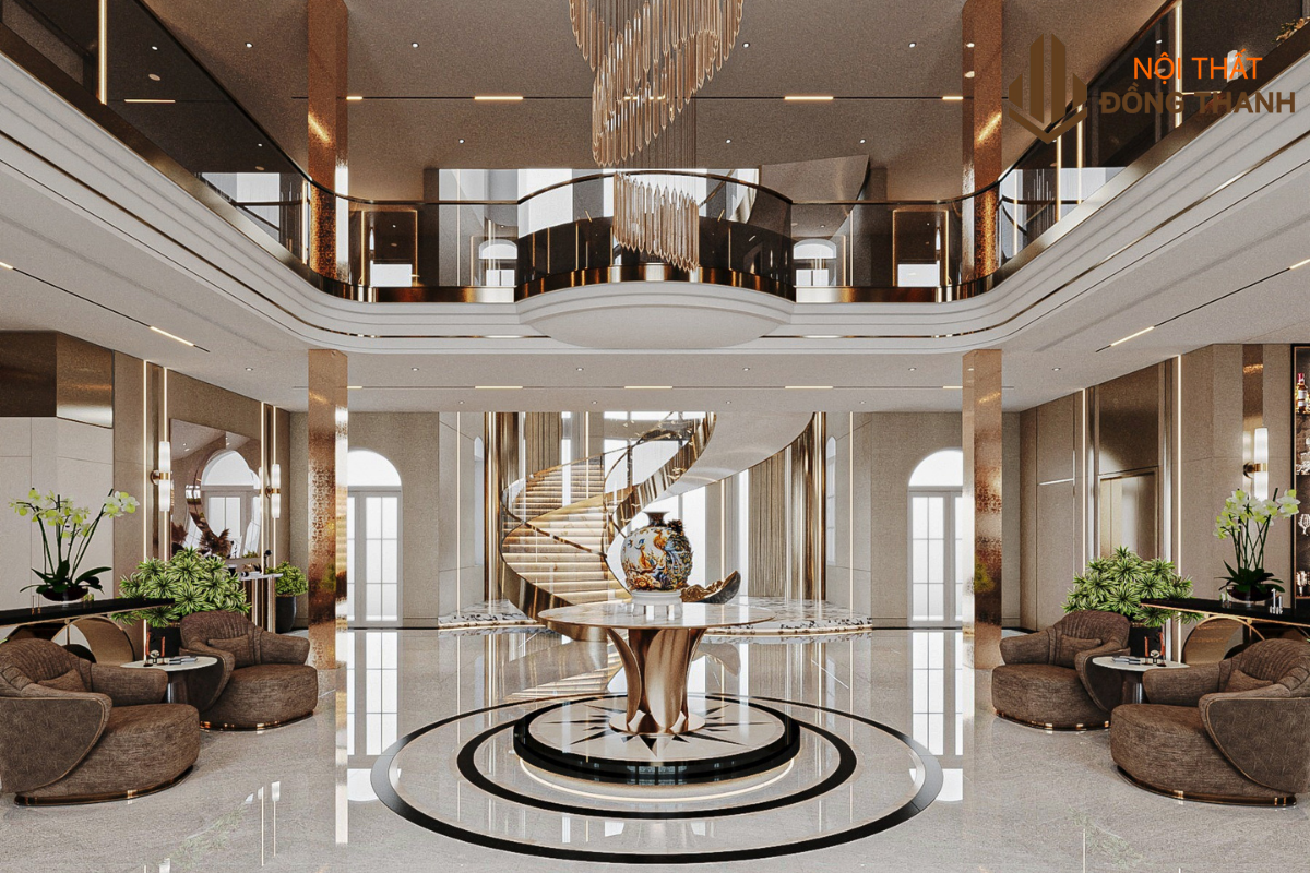 Đại sảnh là không gian được thiết kế với chiều cao trần ấn tượng, ốp đá tự nhiên vân mây kết hợp hệ đèn chùm pha lê ánh champagne, mang đến cảm giác trang trọng và đẳng cấp.