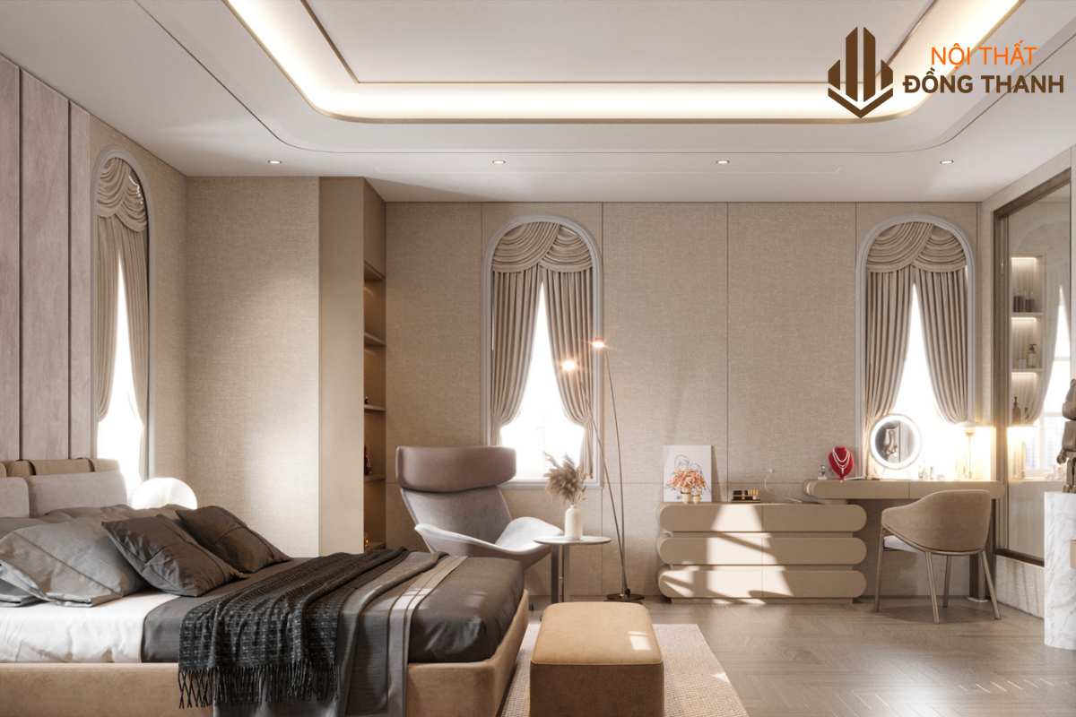 Phòng ngủ master rộng rãi với tone màu trầm ấm: nâu chocolate – ghi xám – be sáng. Giường trung tâm bọc nỉ nhung nhập khẩu, đầu giường được thiết kế liền hệ vách trang trí vân gỗ – tạo cảm giác êm ái và sang trọng.