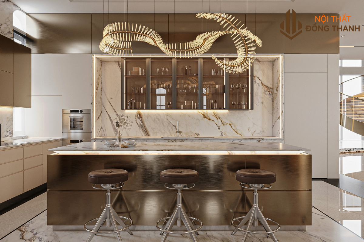 Không gian bếp kết nối mạch lạc với khu vực ăn uống – nơi đặt bàn ăn 6–8 người, dưới hệ đèn thả nghệ thuật tạo điểm nhấn thị giác đầy ấn tượng.