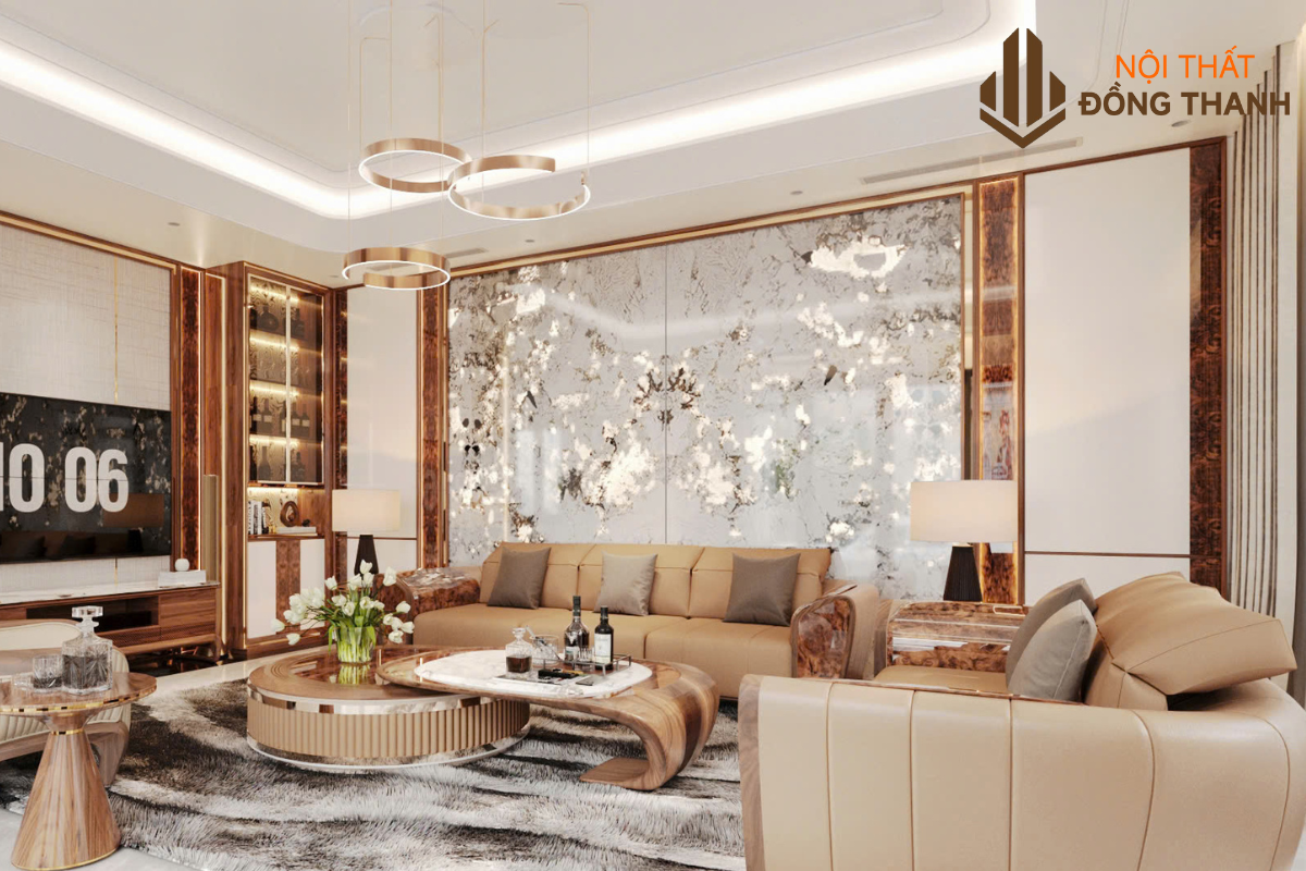 Vật liệu cao cấp: Không gian biệt thự sử dụng chất liệu cao cấp, gỗ óc chó, đá tự nhiên, kim loại mạ vàng, da Ý hay kính trong suốt được phối hợp khéo léo, vừa thể hiện đẳng cấp, vừa giữ nét thanh lịch.