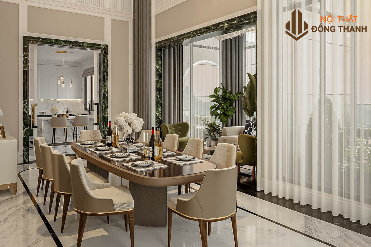 Bàn ăn dài làm kết hợp ghế uốn lượn, nằm dưới hệ đèn rọi ánh sáng dịu nhẹ, tạo nên bầu không khí ấm cúng. Đèn chùm pha lê từ trần cao mở rộng không gian, bàn ăn sang trọng với hệ cửa sổ lớn đóng ánh sáng tự nhiên.
