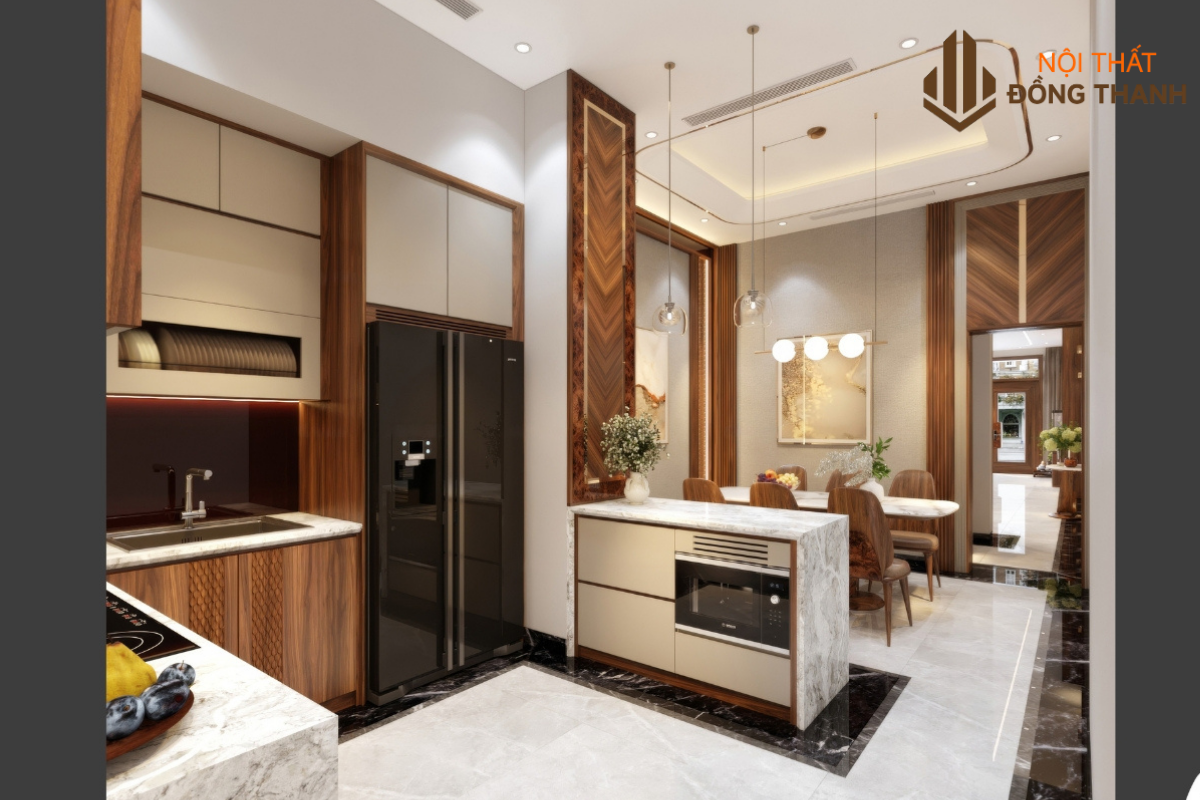 Sự kết hợp giữa gỗ và đá Vicostone sáng màu giúp cân bằng sắc độ, mang lại cảm giác vừa sang trọng, vừa gần gũi. Ở trung tâm, bộ bàn ăn nguyên khối 6 ghế sang trọng. Ánh sáng vàng dịu từ đèn chùm rọi xuống mặt bàn, tạo nên khung cảnh ấm áp, không phô trương nhưng đủ khiến mọi ánh nhìn dừng lại.