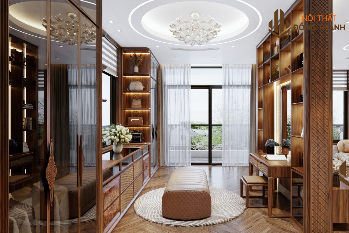 Khu thay đồ tách biệt được thiết kế bằng hệ tủ kính trong suốt, ánh sáng led nội thất hắt nhẹ tạo nên hiệu ứng sang trọng. Không gian ban công rộng, rèm che nắng giúp cho không gian luôn có ánh sáng tự nhiên.