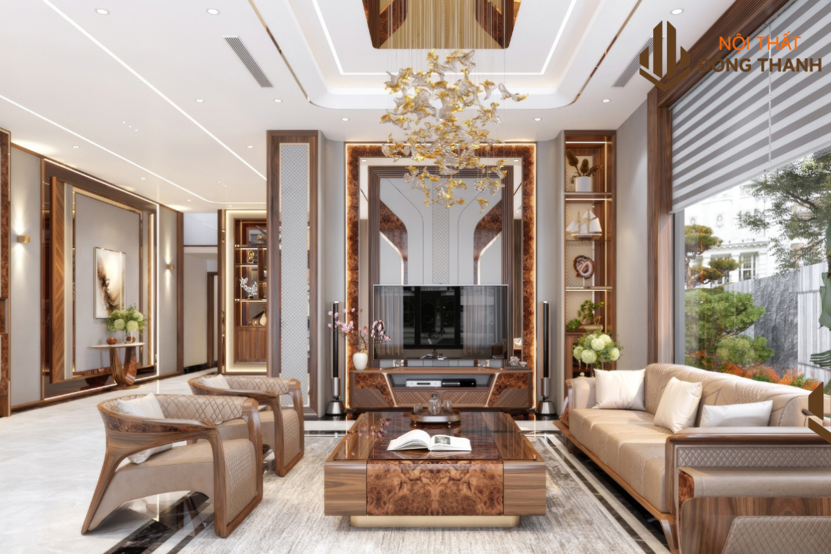Không gian được mở rộng nhờ hệ cửa kính lớn, đón trọn ánh sáng tự nhiên xuyên qua lớp rèm linen mềm mại. Mỗi chi tiết – từ tay vịn, bàn trà, kệ tivi – đều được trau chuốt tỉ mỉ, phản chiếu phong thái đĩnh đạc, sang trọng mà không khoa trương.