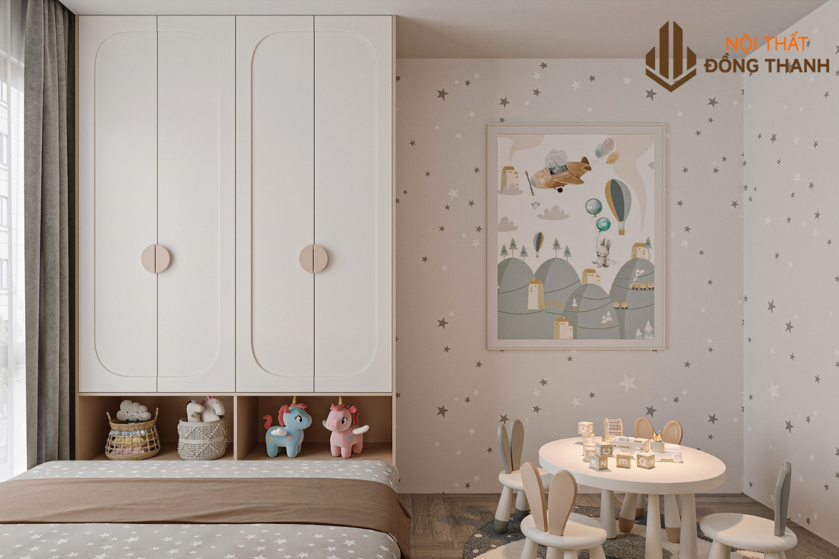 Phòng dành cho con nhỏ được thiết kế với tinh thần vui tươi, linh hoạt và an toàn tuyệt đối. Gam màu pastel nhẹ nhàng kết hợp cùng các chi tiết trang trí sinh động – tranh tường, kệ sách hình khối, đèn ngủ hình thú – khơi gợi trí tưởng tượng và sự sáng tạo của trẻ.