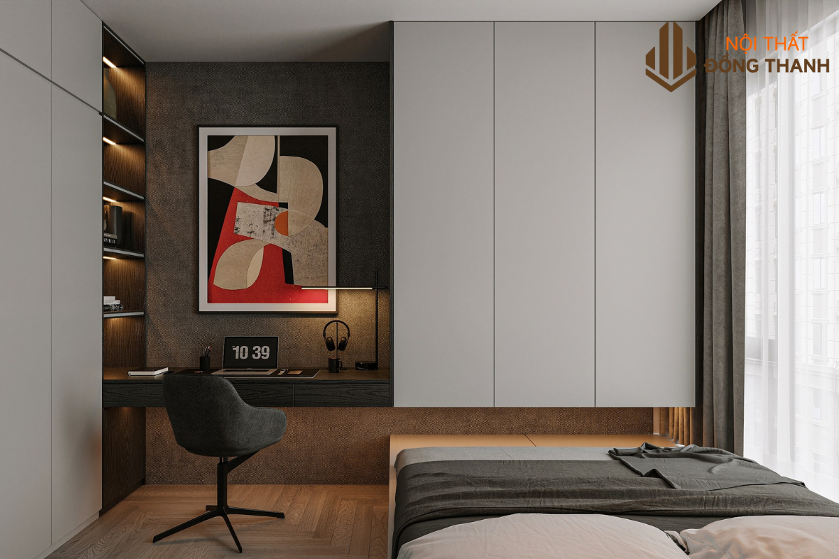 Giường ngủ bọc nỉ cao cấp, đầu giường ốp da và hệ đèn ngủ âm tường tạo ánh sáng dịu nhẹ, giúp thư giãn tuyệt đối. Không gian được tối ưu bằng tủ quần áo âm tường, kết hợp gương lớn phản chiếu ánh sáng tự nhiên, mở rộng cảm giác về chiều sâu.