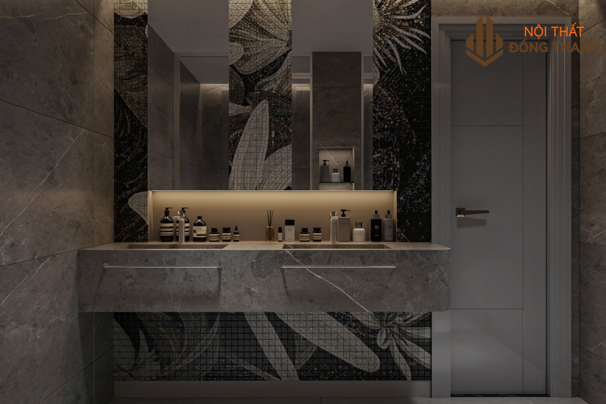 Hệ thống vòi sen âm trần, lavabo đôi, gương soi chống bám hơi cùng ánh sáng vàng nhẹ tạo nên tổng thể hài hòa và đầy tính thẩm mỹ.