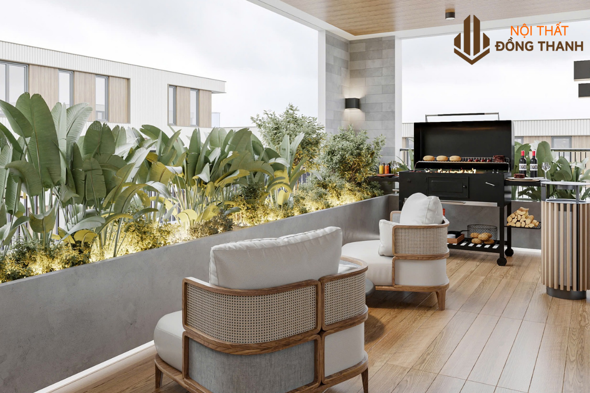 Ban công được thiết kế mở, phủ đầy cây xanh và hoa lá, mang đến cảm giác như hòa mình vào thiên nhiên. Bộ bàn ghế nhỏ bằng mây tự nhiên cùng vài chậu hoa cúc, lavender, hay cẩm tú cầu tạo nên góc thư giãn lãng mạn, lý tưởng cho những buổi sáng sương mờ hay chiều nắng nhẹ, làm BBQ cùng gia đình.